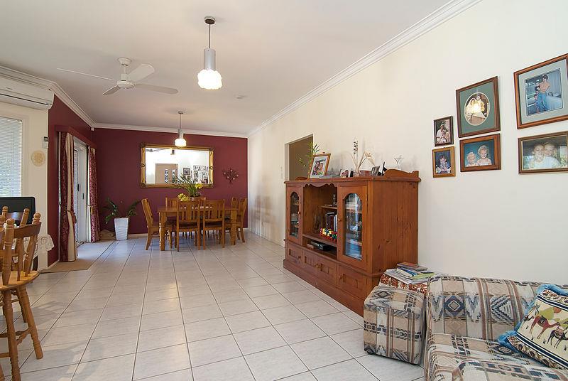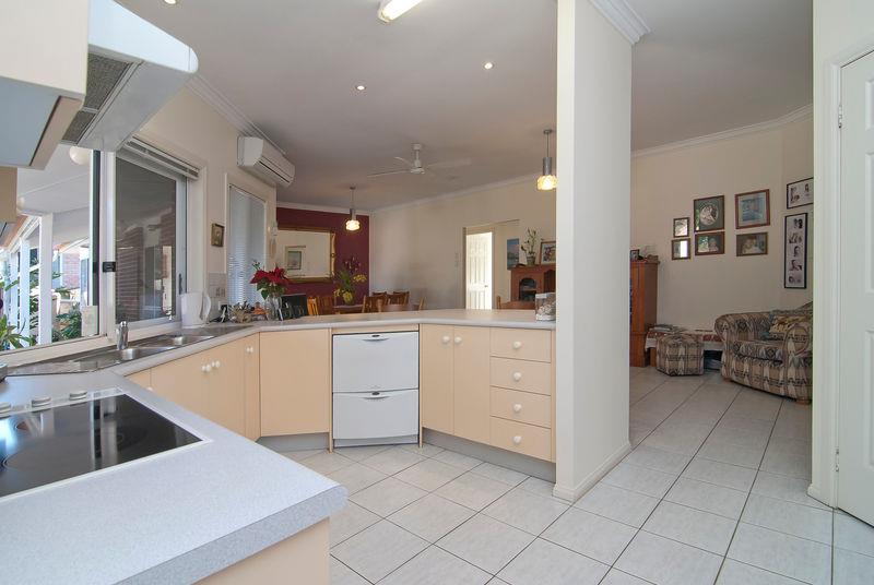 There is a large kitchen with plenty of cupboard space, including a built in pantry plus a 2-draw Fisher & Paykel dishwasher. There is a servery between the kitchen and outdoor deck that is protected by crimsafe. The kitchen is open plan with a large tiled family room, that also has air conditioner as well as a fan, and off course, access again to the outside deck area.