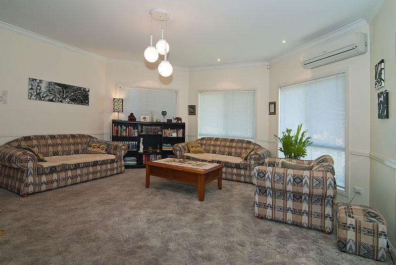To the left is a carpeted, air conditioned formal lounge with quality venetian blinds, that are featured throughout the house, and dimmer switches throughout. Off the lounge is another room with access to the outside deck, that would lend itself well to an office, or even a formal dining room – it’s your choice.