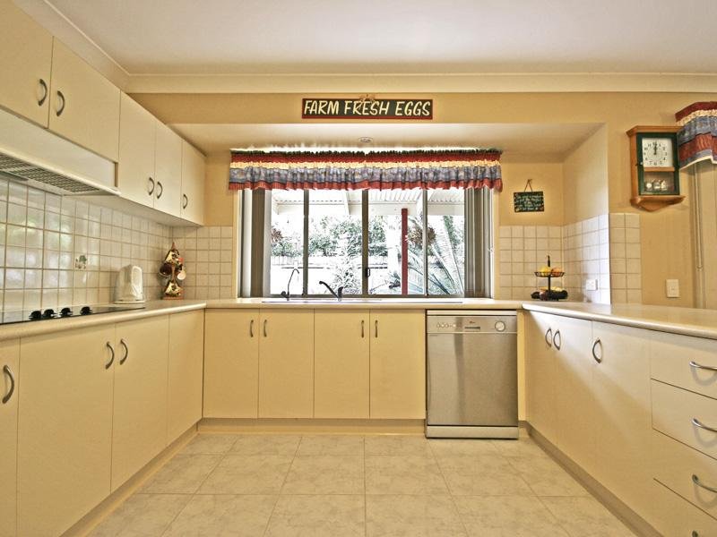 The large kitchen is made for entertaining with a stainless steel Braun dishwasher and a water purifier, and looks out onto the rear entertainment area.