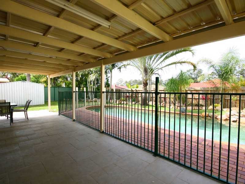 * A large covered outdoor entertaining area overlooking the sparkling in ground saltwater pool complete with rock waterfall.