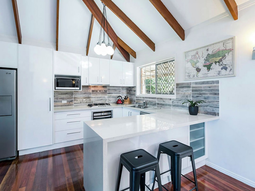 Modern kitchen with stone bench tops with waterfall edge