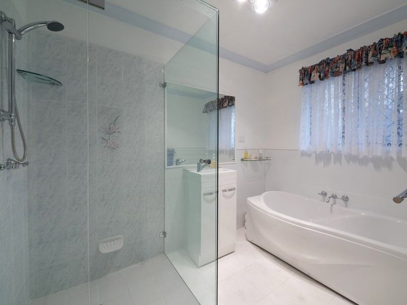 We leave the family room through self-closing doors into the entertainment and pool area, this whole area is tiled and shows real class. There is a solar heated, 7m x 6m salt water fibreglass pool, complete with a spa and next to this a large undercover BBQ area with Café blinds to protect from any prevailing winds.
