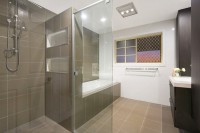 As we move through to the private areas, we find another two bedrooms, again with built in robes and fans, a large tiled main bathroom, with shower and bath, a separate toilet and a large laundry with a linen cupboard. The bedrooms and laundry have access to the outside.
