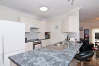 A well appointed, modern kitchen overlooks the casual living areas  a perfect set up for entertaining guests or keeping an eye on the children as they play.